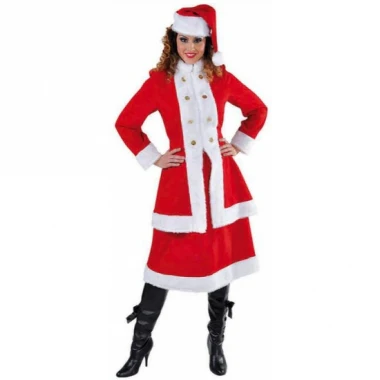 Dit prachtige Kerstvrouwenkostuum is compleet met een lange mantel, een wat langere rok en kerstmuts, geheel in stijl