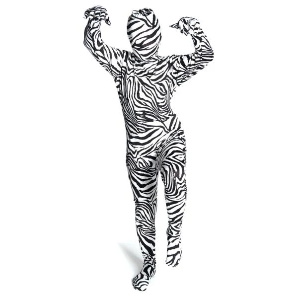 Kind Morphsuit Zebra. Een Morphsuit is een kostuum van rekbaar materiaal dat strak om je lichaam gaat zitten. Je kunt er gewoon door kijken en ook drinken terwijl niemand kan zien wie er in de Morphsuit zit. Een Morphsuit is een super origineel kostuum die je ook kunt dragen met accessoires zoals een bril of pruik. Een pak om duizelig van te worden!
