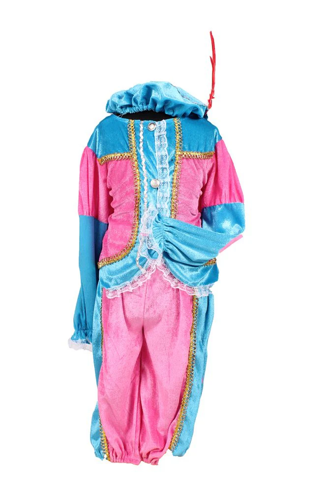 Een echt meisjes kinderpietenpakje in zacht blauw met roze hartjes op de mouw en op de broek. Het pakje is afgewerkt met fraaie goudband en kant. Het jasje sluit met knoopjes en in de broek en mouwen zit bij de boorden elastiek. Dit super leuke pakje is gemaakt voor meisjespieten en bestaat uit het jasje, broek en baret met een klein veertje. De meisjes pietenpruik met vlechtjes is een aanrader bij dit kostuumpje, evenals een leuke maillot en wat pietenschmink om het plaatje compleet te maken. Het pakje valt eerder klein dan groot, bij twijfel is de grootste het advies.