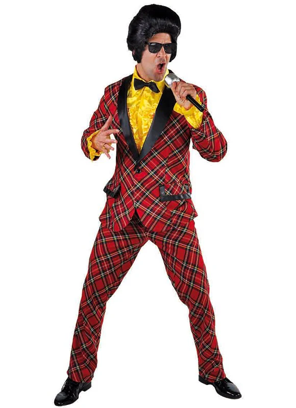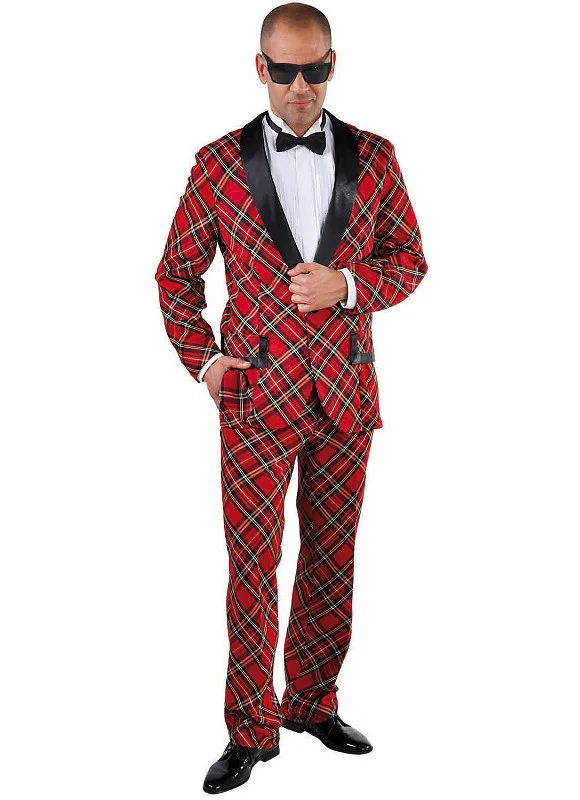 Een flitsend kostuum met rode, schotse ruit, een pak met broek en colbert voor diverse gelegenheden te gebruiken