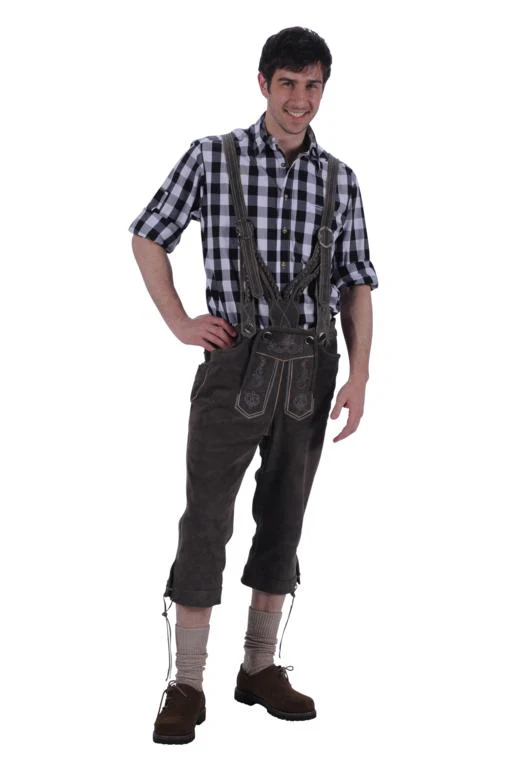 Lederhose, lang model driekwart, stoere lederhose van wildleder, mooie kwaliteit, volledig gevoerd. Deze lederhose is met bretels en borduursels. Mooi product van prima kwaliteit.