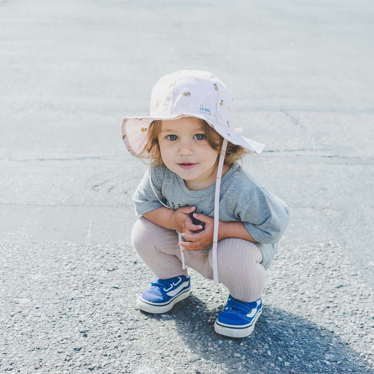 100% katoenen zomerhoedje voor baby’s met UV-stralen en een iets langere kap in de nek om het hoofdje en de nek te beschermen tegen de zon. Knoopsluiting om de maat aan te passen voor een perfecte pasvorm. Op de voorkant een kleine witte Lil’ Boo patch.