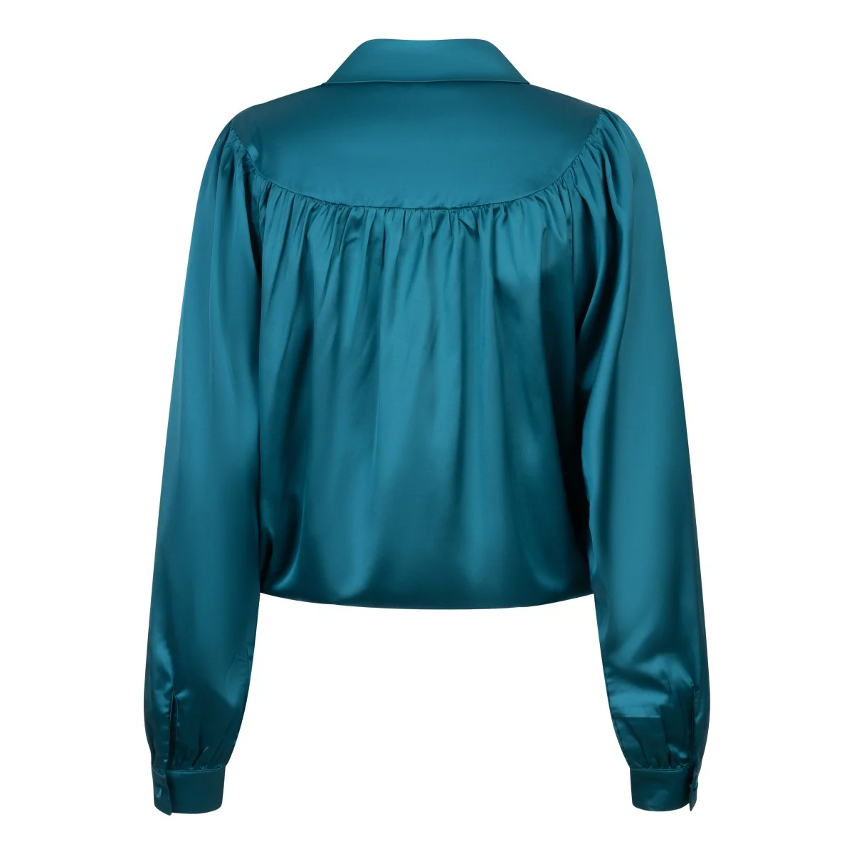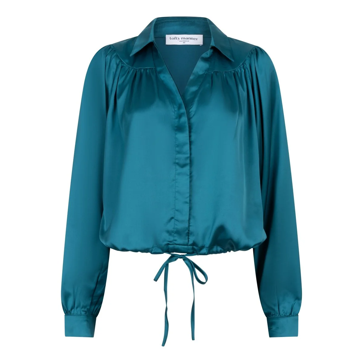 De Dalia blouse van Lofty Manner is een prachtige blouse in de kleur teal. Deze dames blouse heeft een mooie gladde, satijnen afwerking en heeft een v-hals. De bijzondere schoudervorm zorg ervoor dat de blouse een elegante uitstraling heeft.