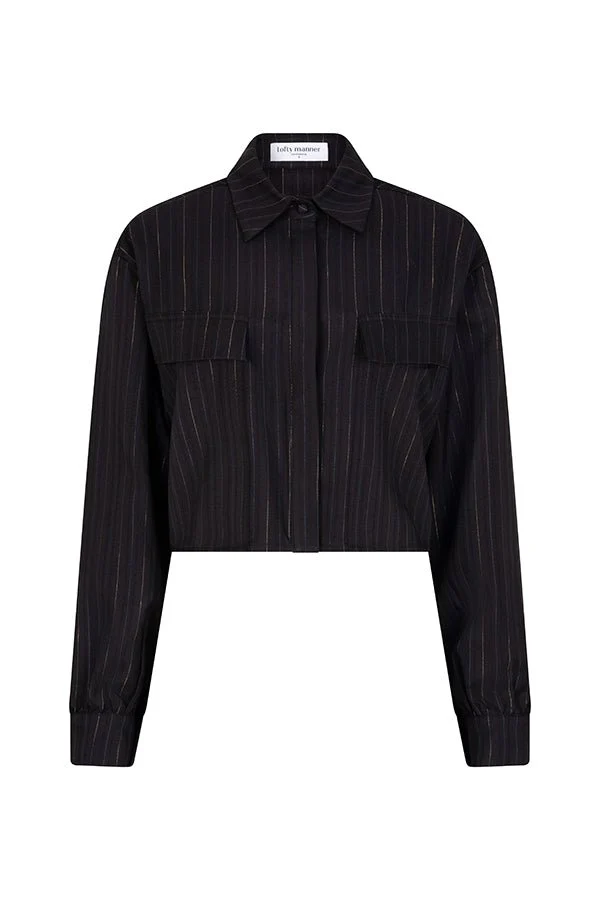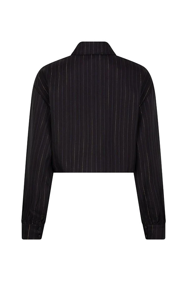 Saaie basic zwarte blouses? Daar doen we bij Jo&Co niet aan. De Viola blouse van Lofty Manner is dan wel een cropped blouse in het zwart, maar heeft een glinsterende gouden krijtstreep door de stof verwerkt, wat hem net even wat chiquer en stijlvoller maakt. Deze korte blouse heeft een klassieke kraag, verlaagde schouders, borstzakken en een knoopsluiting.