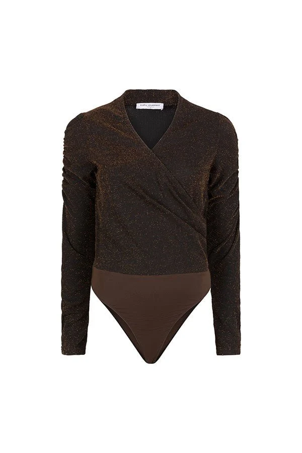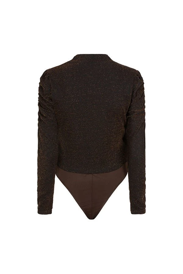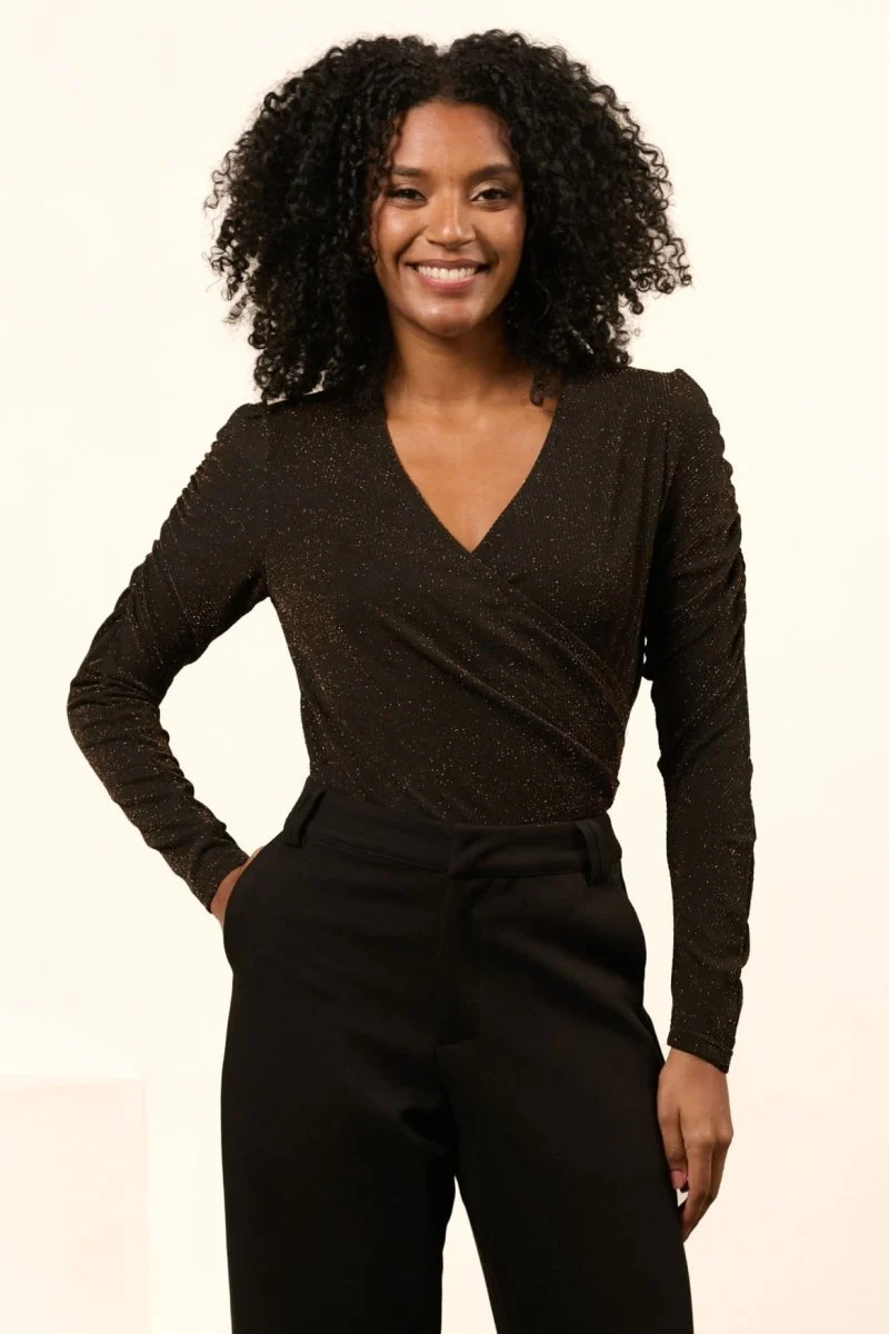 Een top met glitters is altijd goed! De Everly body van Lofty Manner is een bruine glitter string body voor dames. Deze dames body heeft een aangesloten pasvorm, een V-hals, pofmouwen en een wrap-detail. De glinstering door de lurexdetails geven de Everly body een luxueuze uitstraling.