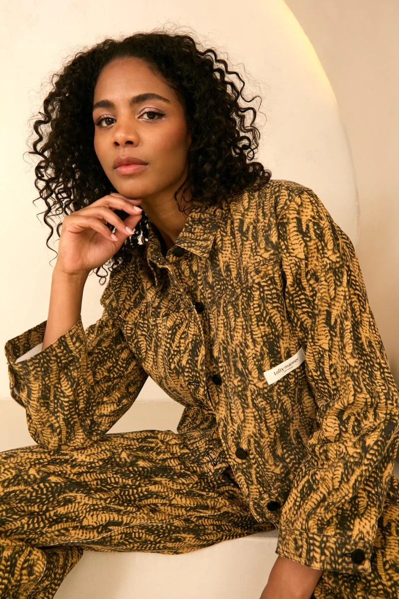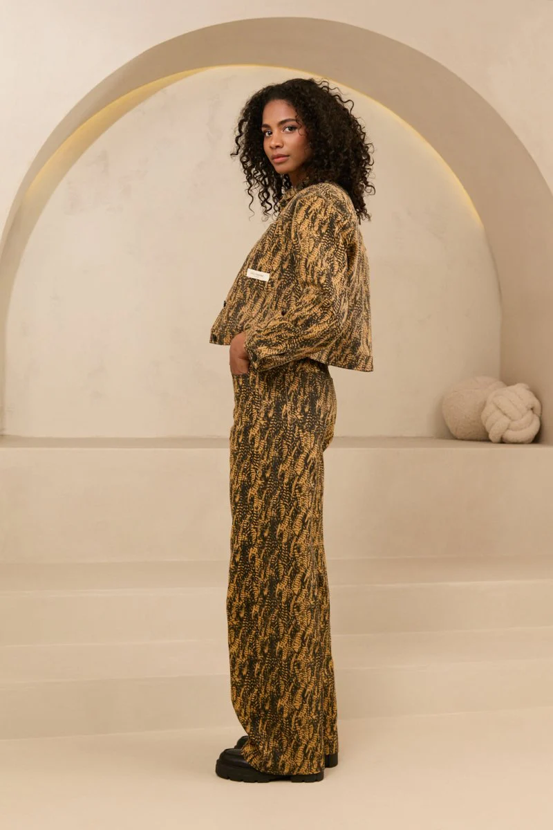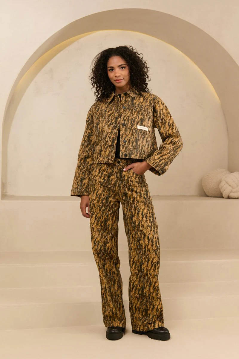 Door de zwarte kleur in het patroon van het jasje is hij perfect om te combineren met onze Saffron pants van Fluresk.