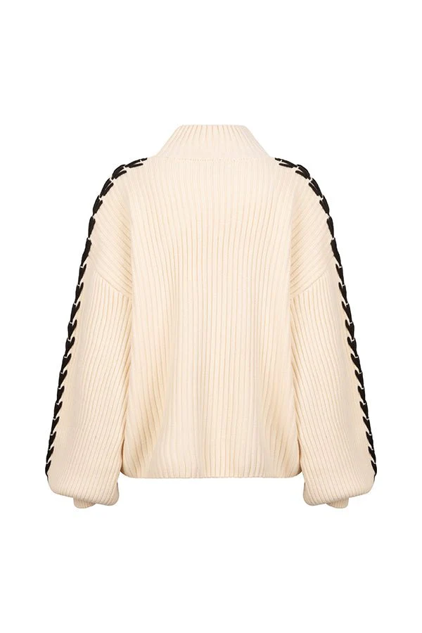 Truien met pofmouwen zijn helemaal hèt. Daarom is de Evelyn trui van Lofty Manner de trui die je aan je garderobe wil toevoegen. Deze dames trui is een perfect voorbeeld van een basic trui met details die net even anders zijn. Hij is dus ook ontworpen voor vrouwen die houden van comfy, maar niet willen inleveren op stijl. De Evelyn trui is een beige kabeltrui met een gevlochten detail bij allebei de (pof)mouwen.