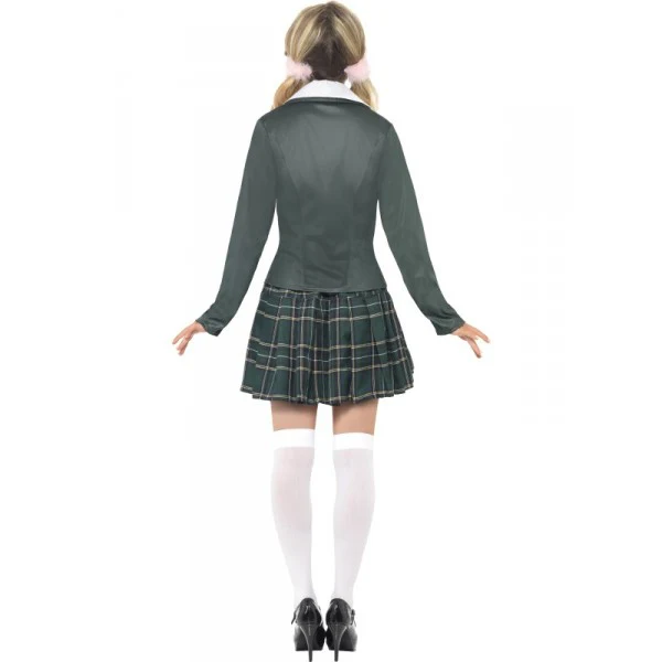 Compleet Nerd University Pakje, dit school girl kostuum bestaat uit een rokje, witte blouse van soepel materiaal en kraag, kort groen jasje met university badge en roze, zachte bandjes om strikjes in het haar te maken