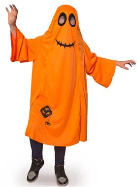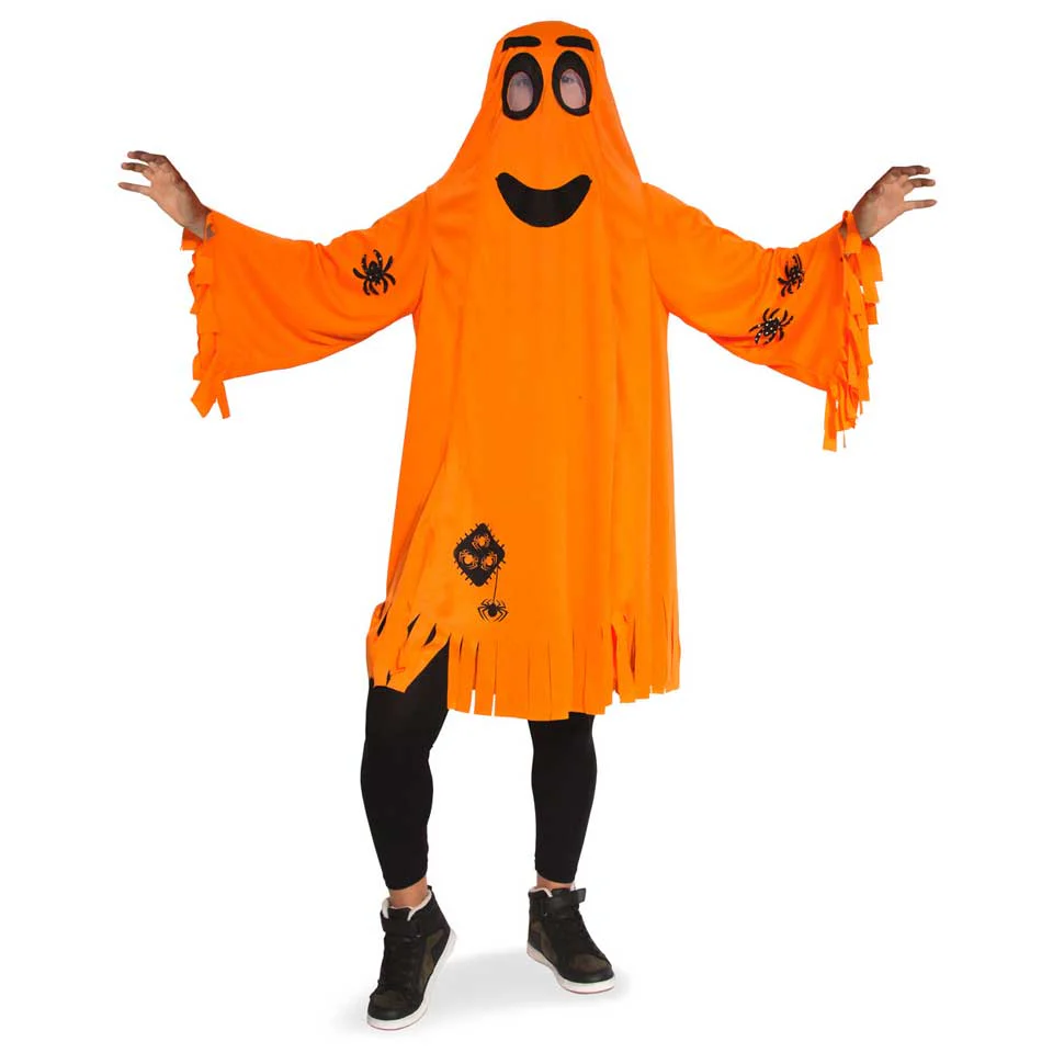 Oranje Spook met spinnen, makkelijk te dragen en met grote kijkgaten, Fel oranje spook-gewaad met zwarte spinnen, erg leuk voor Halloween of spookfeestje OP=OP