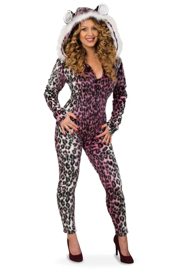 Een zachte pluche panter met een dikke staart, fraaie capuchon met oortjes en een bontrandje, dit panterpakje is van dikke, zachte pluche