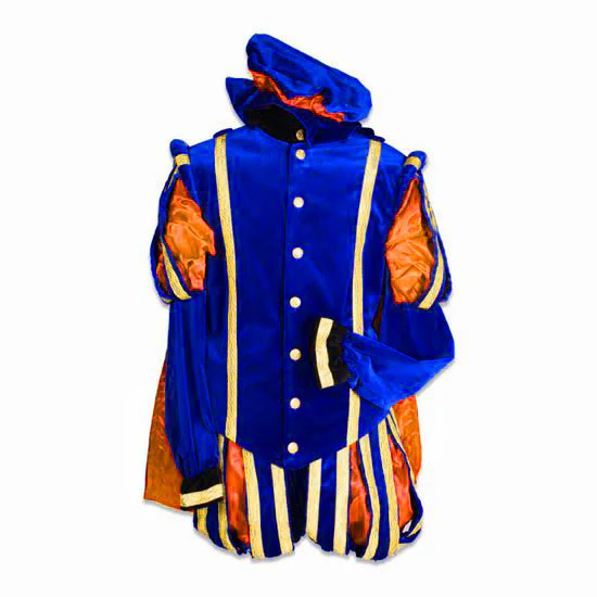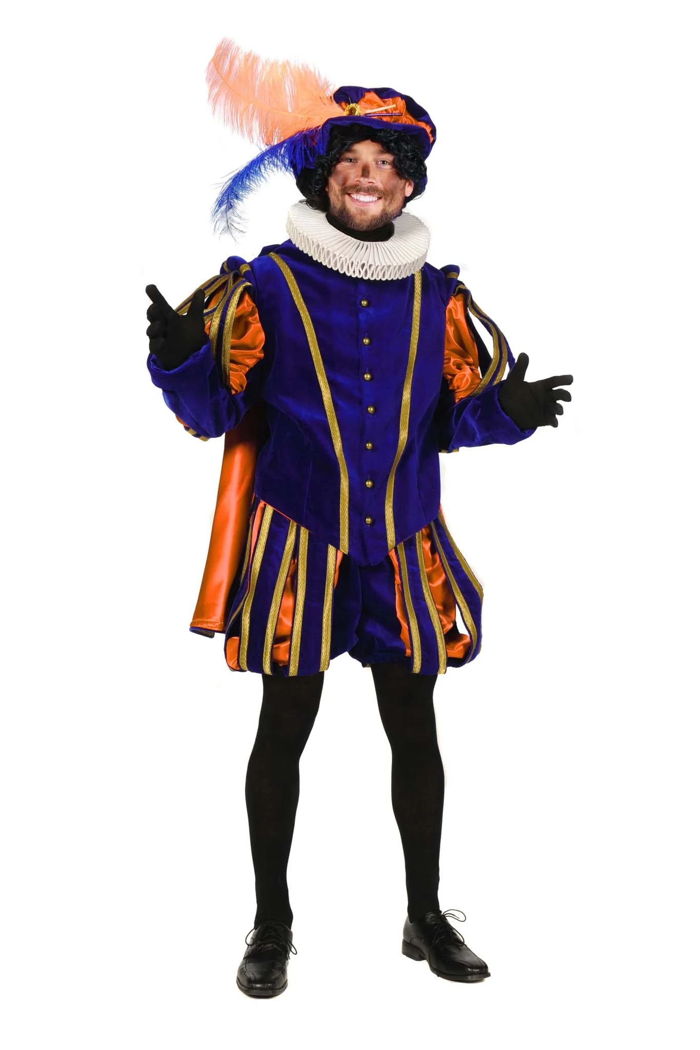 Pietenpak in Polyester uitvoering, vrijwel niet te onderscheiden van echt fluweel, van de polyester kostuums is dit de meest luxe uitvoering met zeer fraai goudband, afgezet met Oranje satijn in de mouwen en broek. Dit pietenmodel is dezelfde als de fluwelen Bennie Stout uitvoering, maar dan in polyester, ook met satijnen, gevoerde cape.
