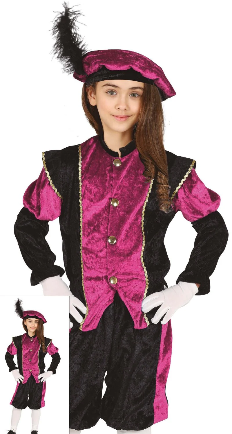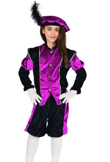Wil je een echt Pietenpakje met mooie pietenkleuren voor kinderen, dan is de paarse een goede optie. Dit pakje is geschikt voor zowel jongens als voor meisjes en bestaat uit de jas, broek en baret.