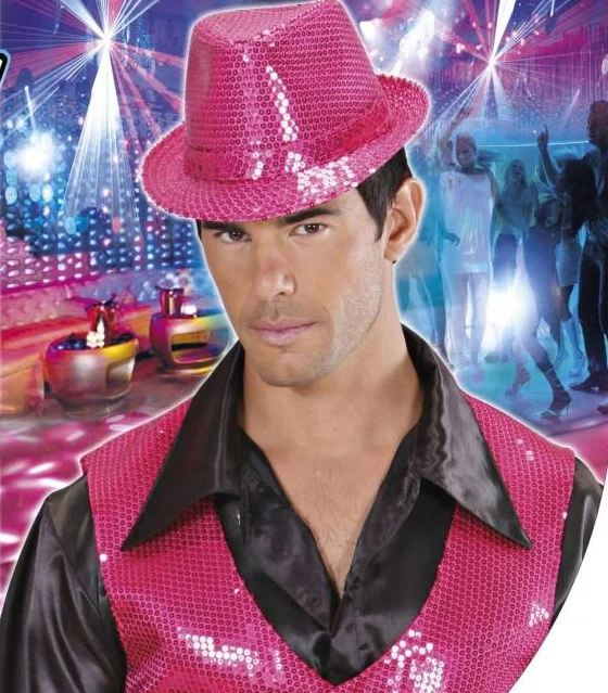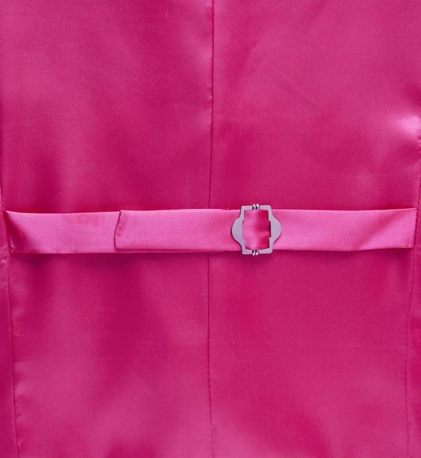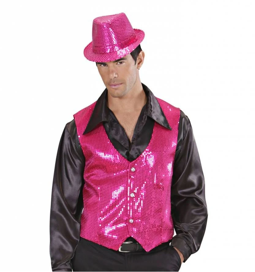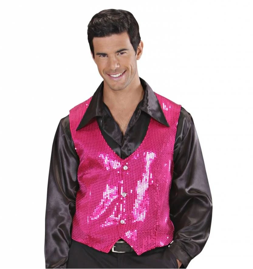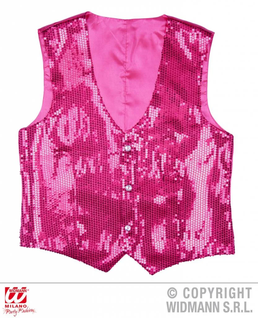 Zoek je een opvallend vest in roze, dan is dit roze glittervest iets voor jou. Aan de achterzijde van dit roze paillettenvest zit een riempje (zie foto). Het Gilet is verkrijgbaar in 2 maten