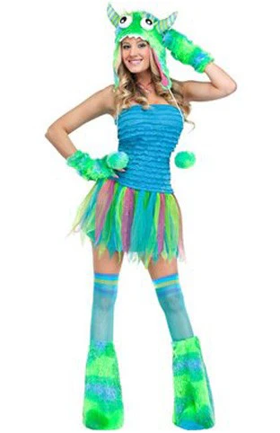 Sexy Beast kleurig pakje bestaat uit het jurkje, muts, armwarmers en beenwarmers, een zeer kleurig kostuum in groene en blauwe tinten voor dit zeer vriendelijk en aantrekkelijk monster