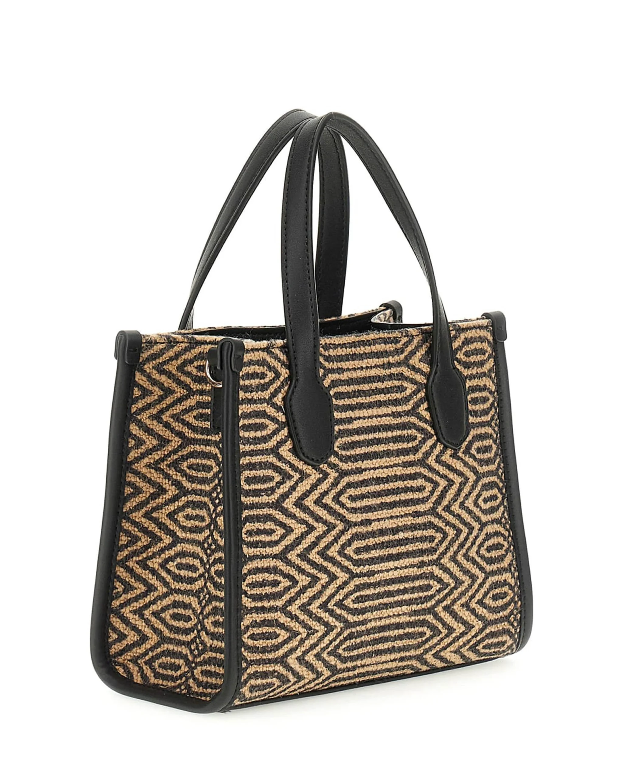 Met zijn compacte formaat is de handtas eenvoudig mee te nemen, terwijl het toch voldoende ruimte biedt voor al uw essentiële items. De unieke geweven textuur in combinatie met de klassieke zwarte accenten geeft de tas een moderne uitstraling.