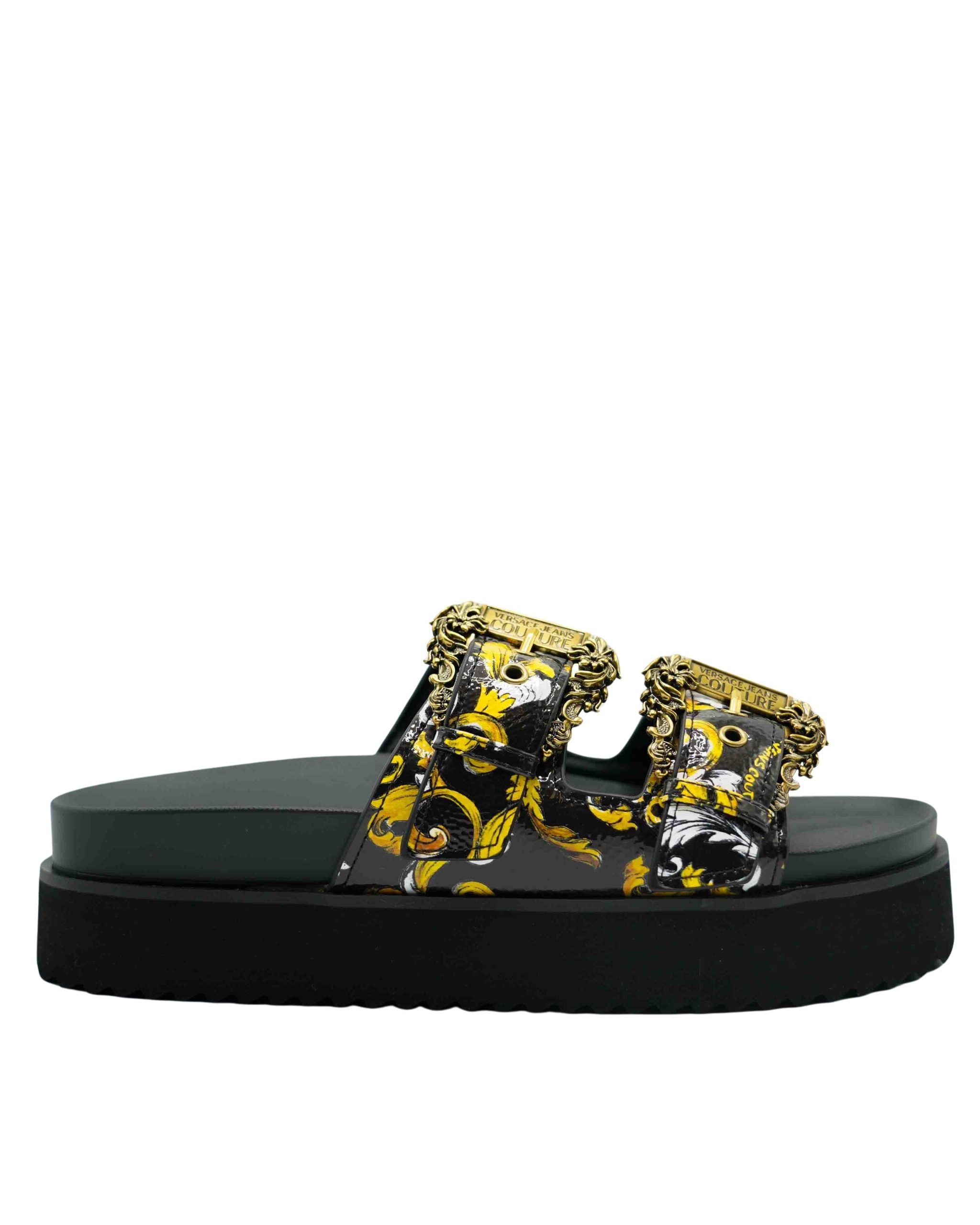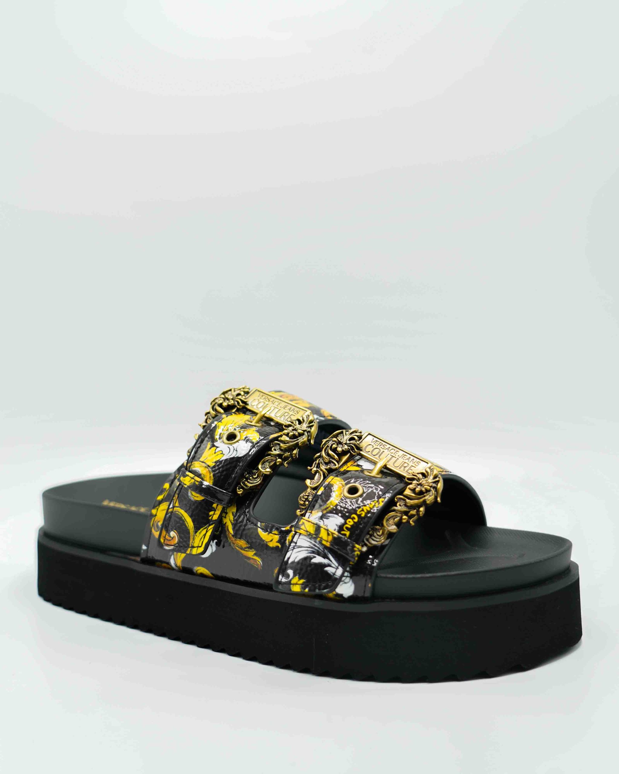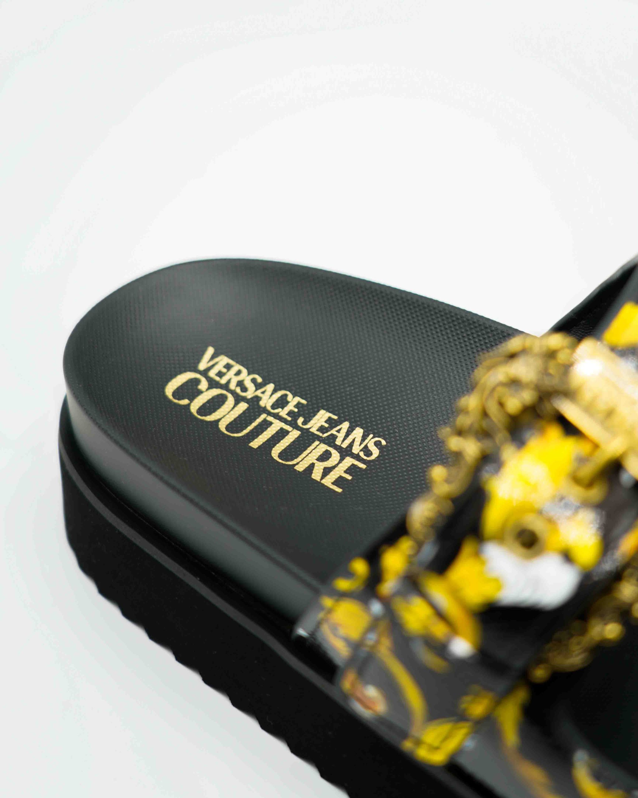 Stap stijlvol de zomer in met deze luxueuze Schoenen van Versace Jeans Couture. Deze elegante Slippers combineren een verfijnde uitstraling met maximaal comfort. Het iconische ontwerp en de diepe zwarte kleur maken het een veelzijdige keuze voor elke zomerse dag.