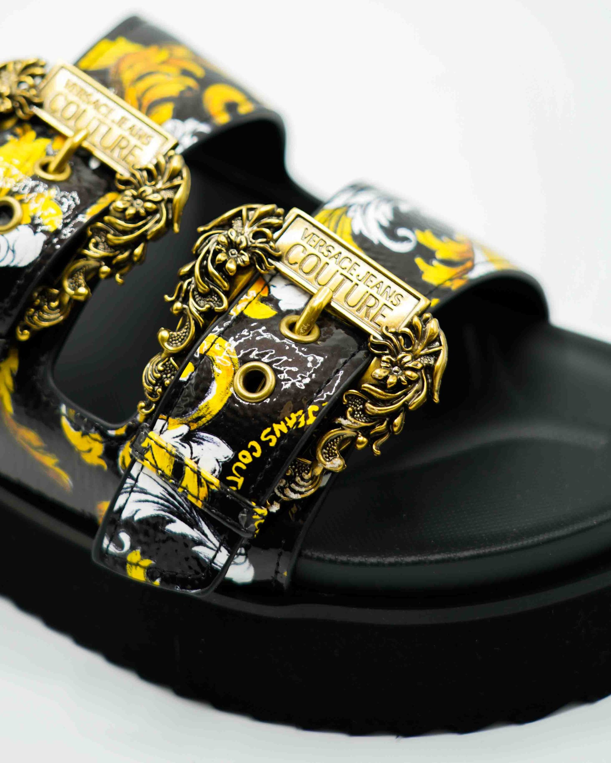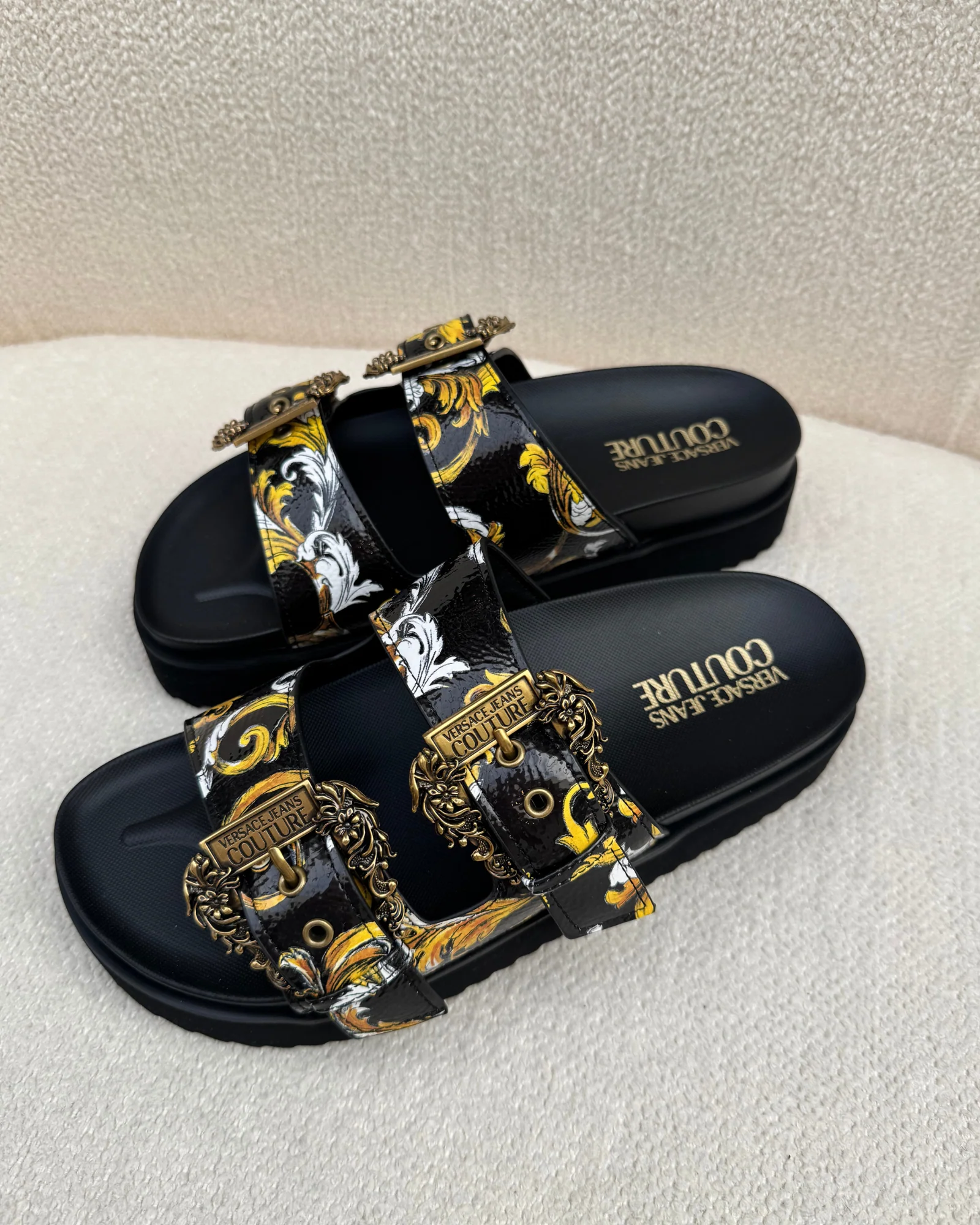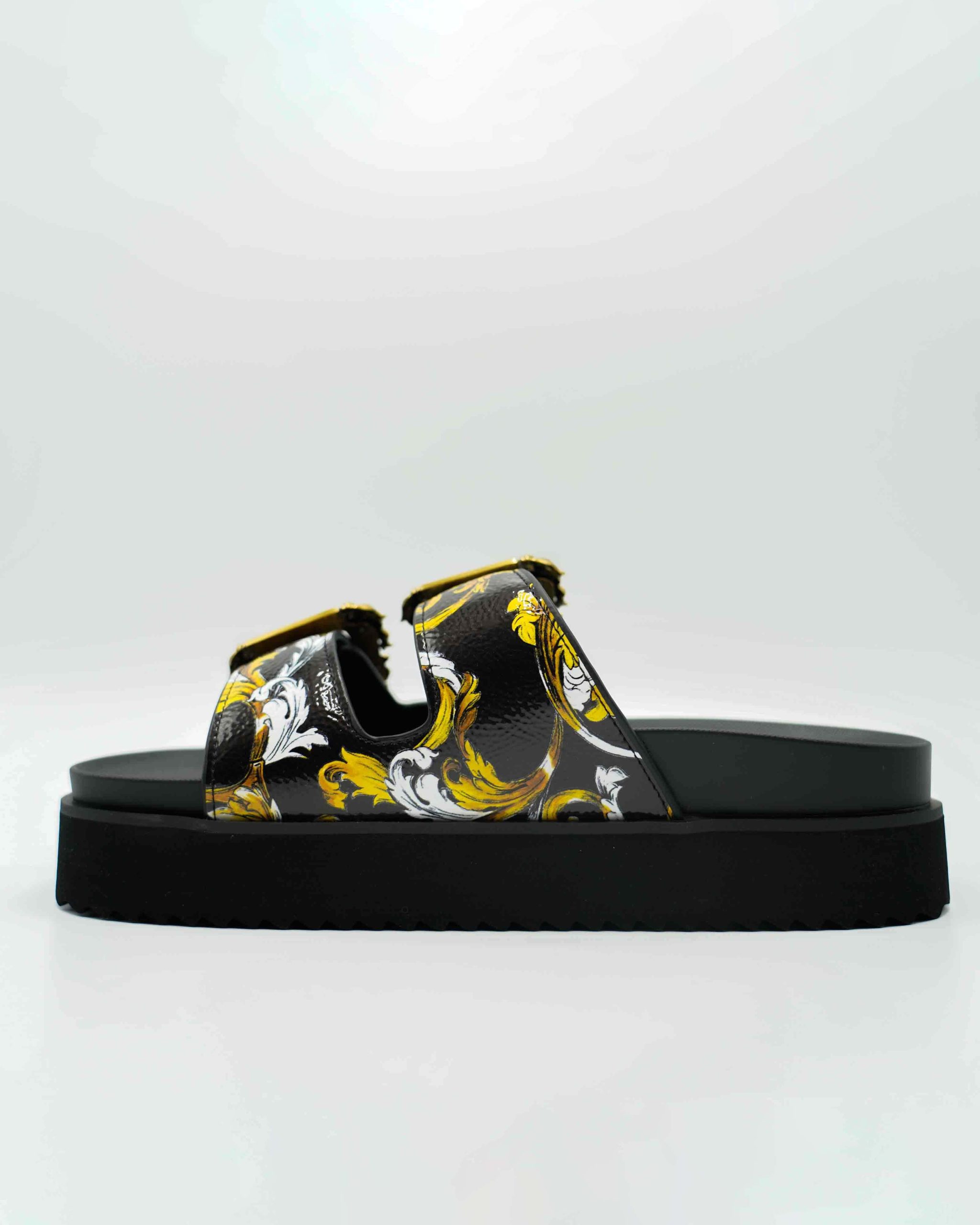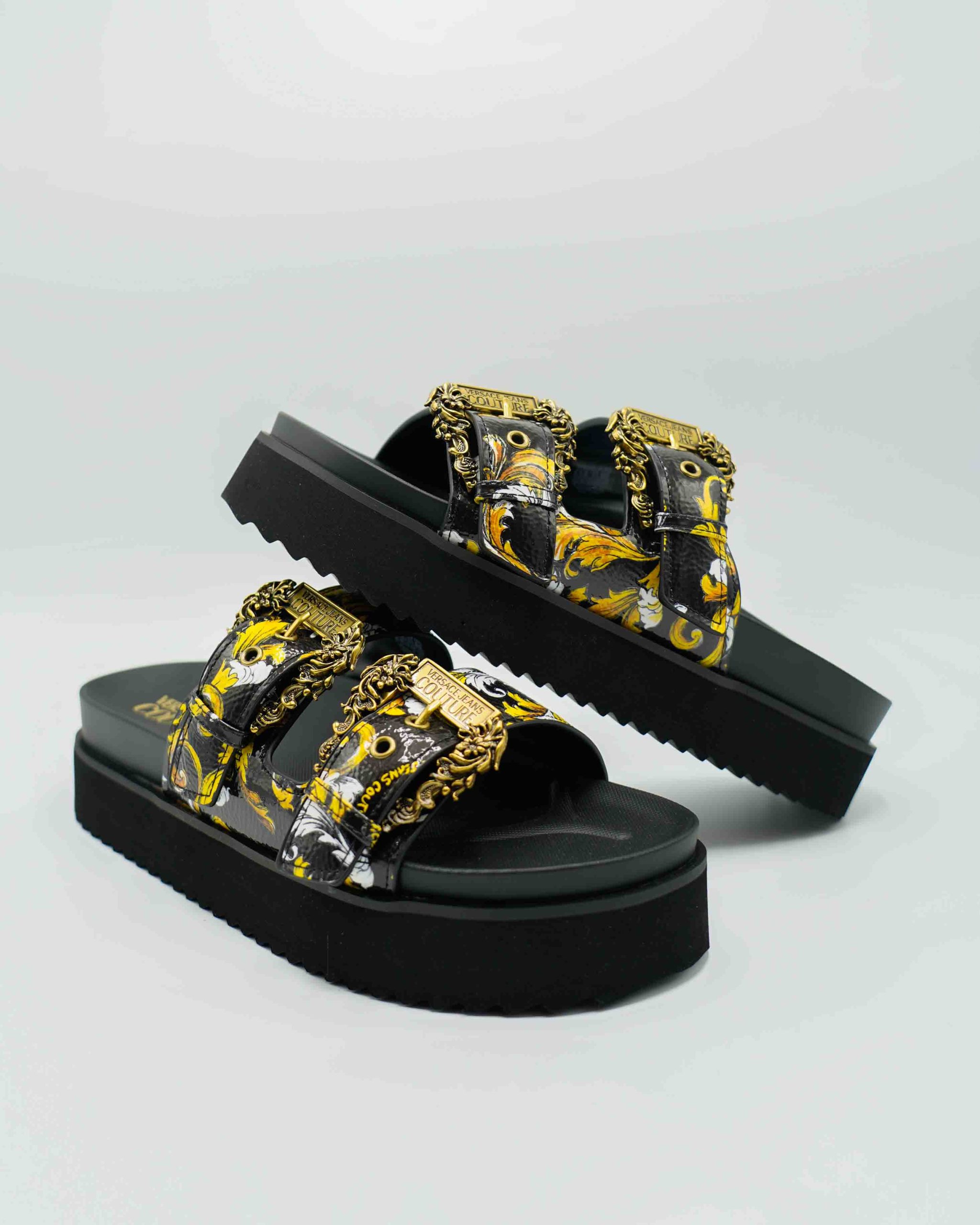 Stap stijlvol de zomer in met deze luxueuze Schoenen van Versace Jeans Couture. Deze elegante Slippers combineren een verfijnde uitstraling met maximaal comfort. Het iconische ontwerp en de diepe zwarte kleur maken het een veelzijdige keuze voor elke zomerse dag.