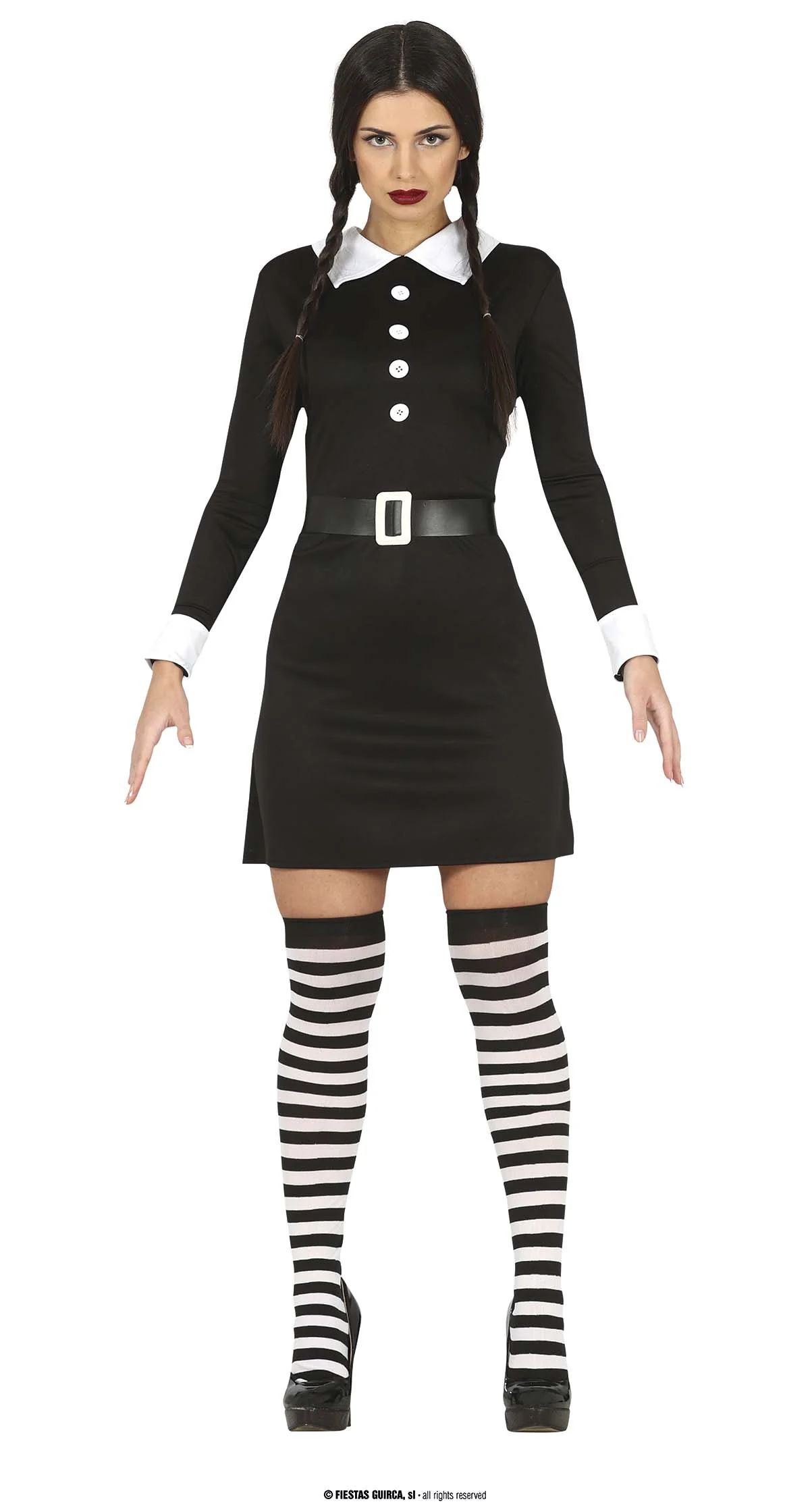 Super leuk en betaalbaar Halloween jurkje, lijkt op het bekende Adams Family jurkje van Wedbesday. Bestel ook meteen de bijpassende zwarte pruik met staartjes om het helemaal compleet te maken