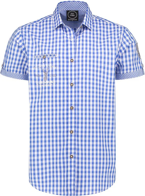 Deze hippe Tiroler blouse heeft korte mouwen met geweldige borduursels op de borst en mouw. De blauw-witte blouse heeft echte Tiroler hertenhoorn look knopen, helemaal in stijl.