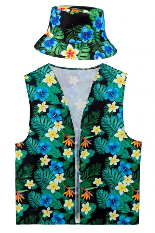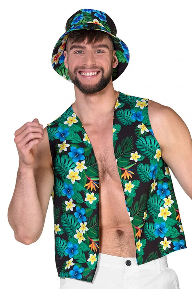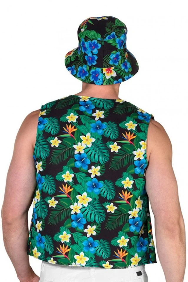 De ultieme toerist en festival set, een bloemen gilet met een bijpassen bloemenhoedje. Een Hawaii kransje er bij een zonnige bril en je bent helemaal klaar voor het (Hawaii) feestje, meer heb jij niet nodig. De set is one size, maat ongeveer maat L maar ook prima voor iemand met maat M