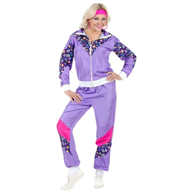 Een heel sportief maar fout trainingspak uit de jaren 80 of jaren 90, de verkleedset bestaat uit een trainingsjas en een trainingsbroek, pruik, zweetbandjes of brillen zijn los bij te bestellen