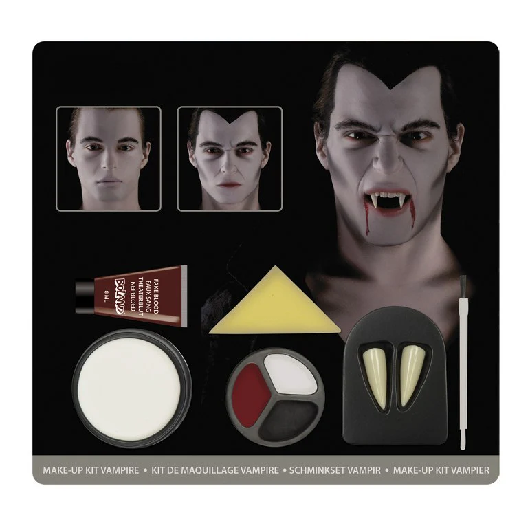 Verkleed als Vampier? Dan mag de Vampier Schmink set niet ontbreken! Een complete Vampier Schmink Set met Vampier hoektanden en een tube nepbloed (11ml). Voor het gewenste effect bevat deze set ook rode, witte en zwarte schmink, maak een echte vampier met deze set!