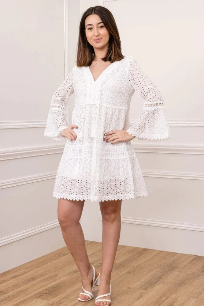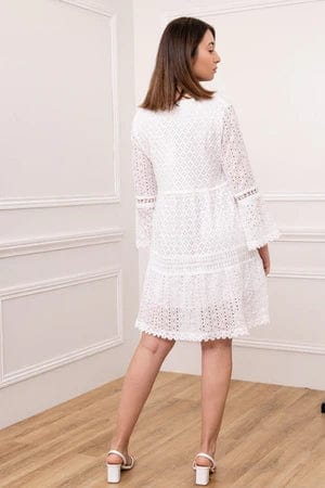Ervaar de essentie van Ibiza chic met deze witte korte kanten jurk, een symbool van puurheid en ongecompliceerde schoonheid. Deze jurk is je ultieme metgezel voor elke zomerse gelegenheid, waarbij de klassieke witte kleur en het subtiele kant een sfeer van licht en vrijheid creëren.