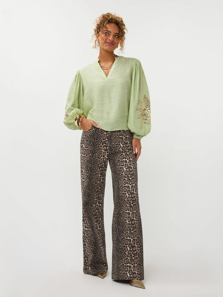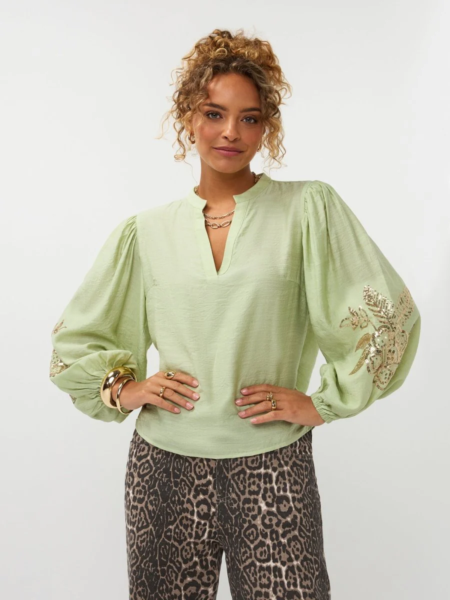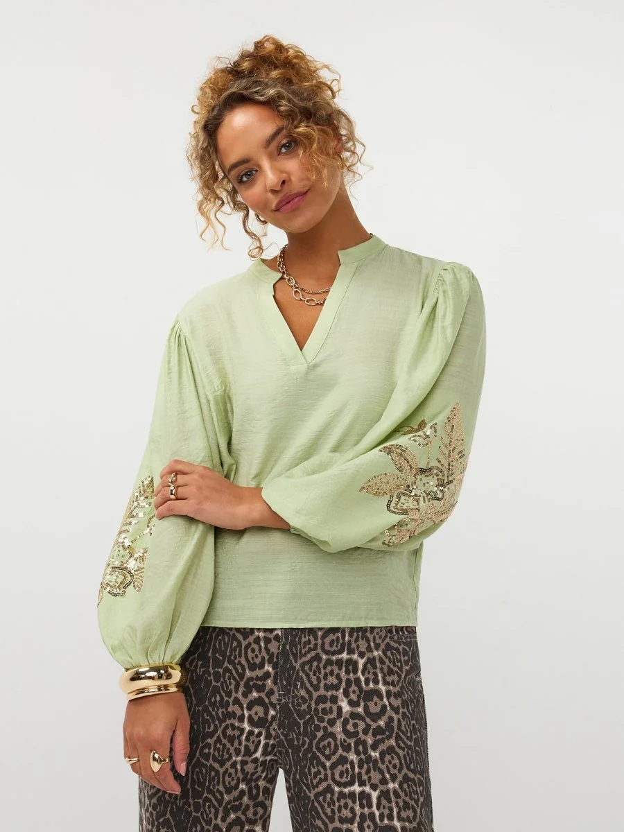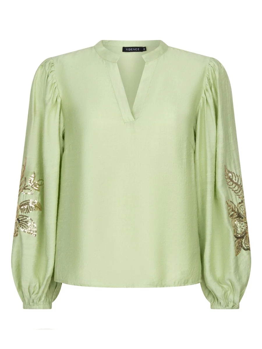 Een blouse met een pofmouw en een glittertje? Daar zeggen wij geen nee tegen! De Rose blouse van Ydence is een dames blouse in de prachtige kleur soft green met een v-hals. Wat deze blouse helemaal afmaakt zijn de pofmouwen en het glitterwerkje daarop.