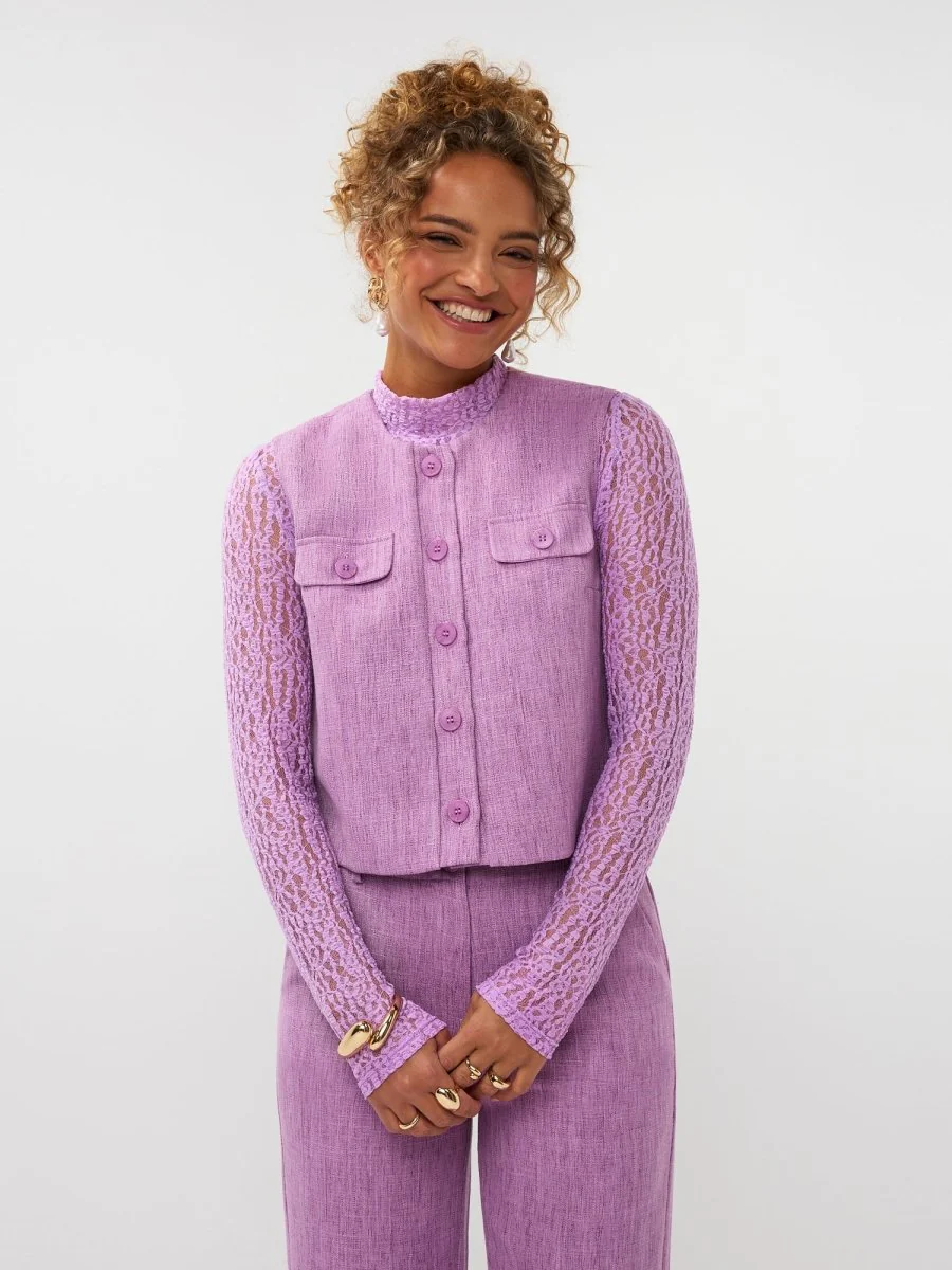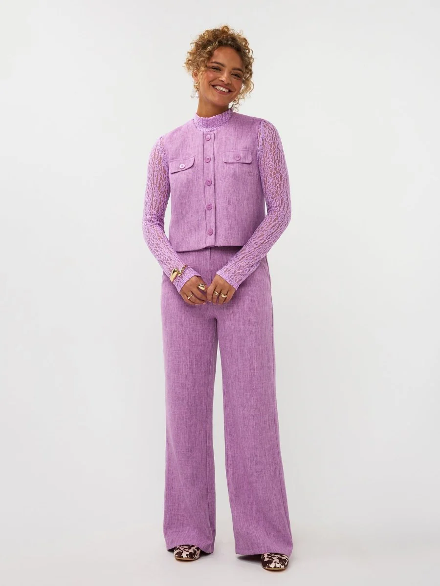 Draag het Amanda gilet in het paars op de Leona broek voor een vrolijke co-ord set! Draag er een leuke kanten top met lange mouwen onder voor net wat extra warmte.