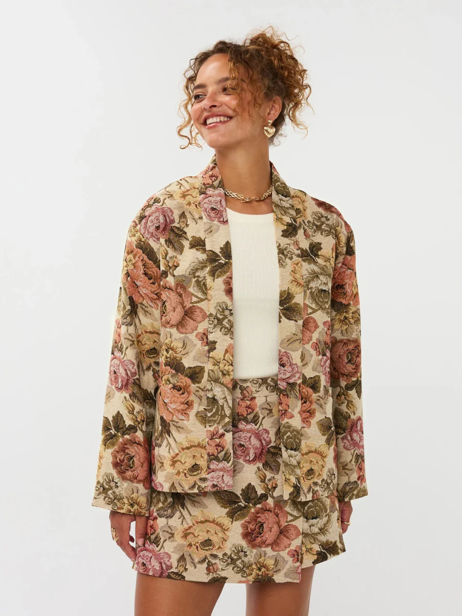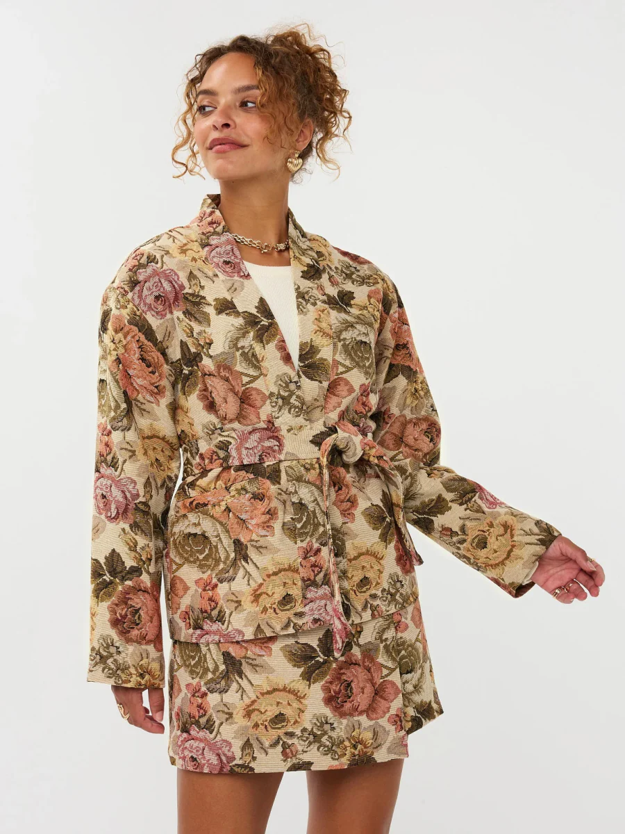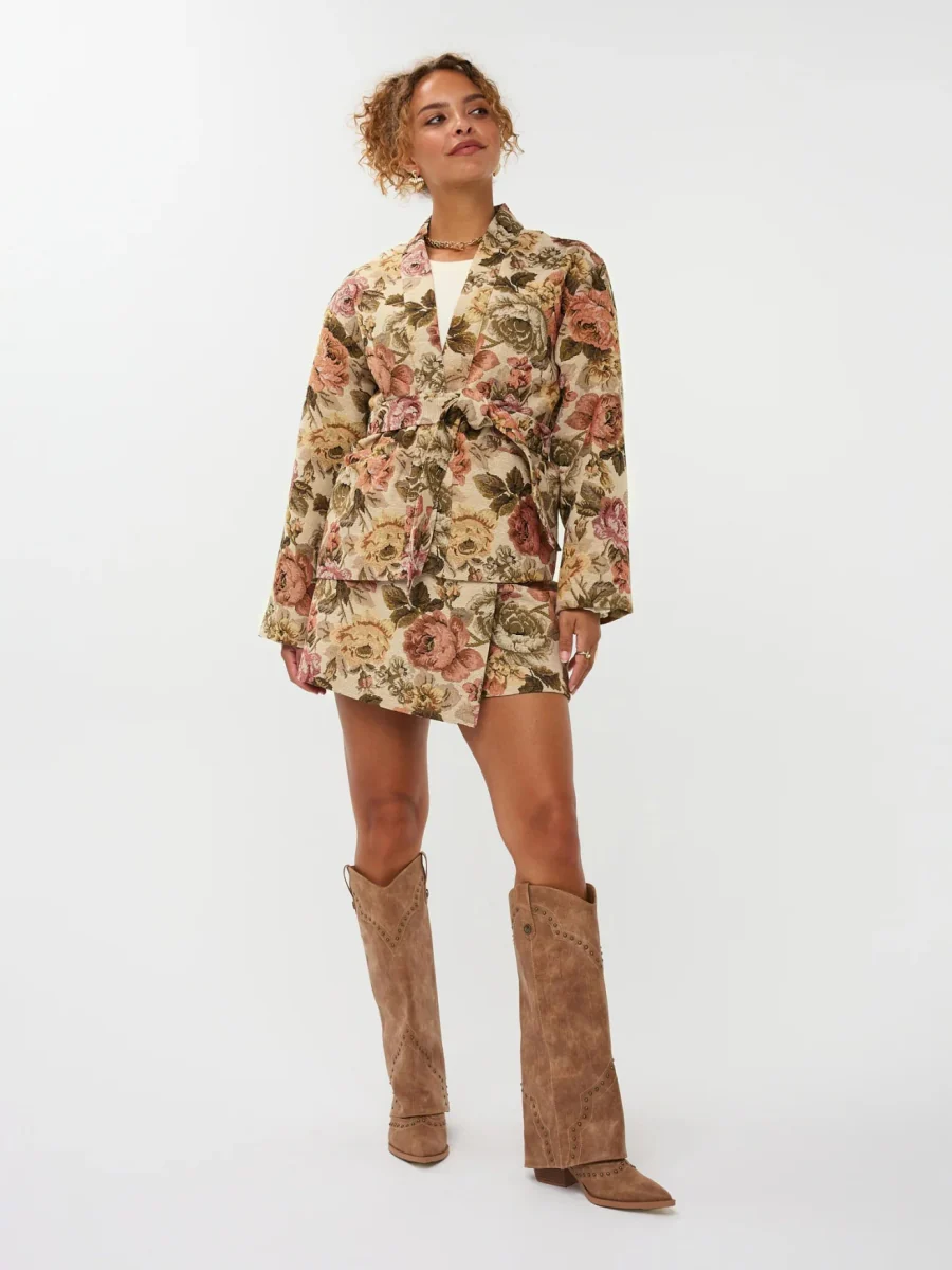 De Ydence Penny Kimono is het perfecte dames jasje als je stijlvol de herfst door wil komen! Dit prachtige jasje lijkt net op een kunstwerk door de bloemenprint gecombineerd met de mooie stof. Het stikceintuur zorgt ervoor dat je je taille mooi kunt accentueren, wat zorg een flatterende look.