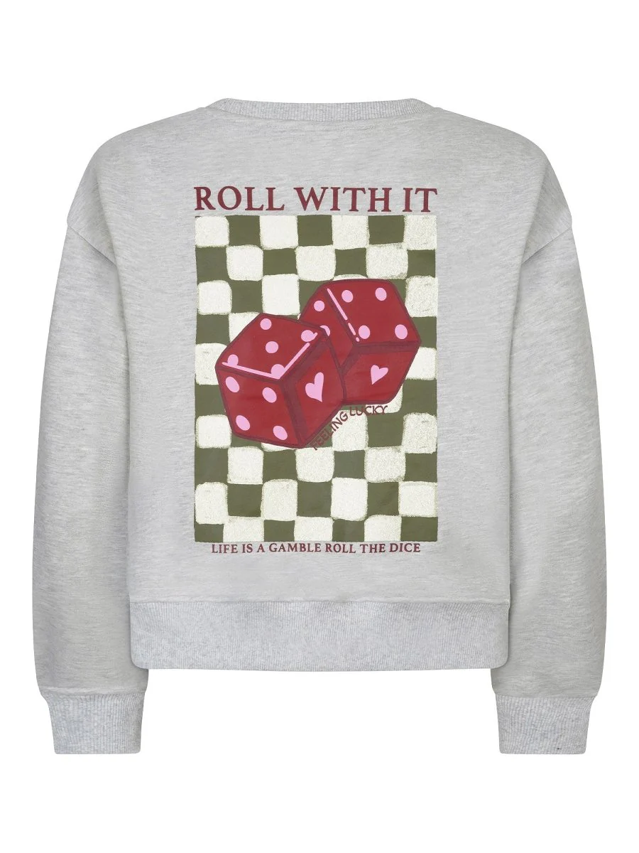 Roll with it met deze sweater van Ydence! Dit is toch de perfecte sweater voor deze periode?! De Roll with it trui is een grijze sweater met aan de voorkant klein “roll with it” op de linkerborst geschreven. De achterkant van deze trui is de echte eye-catcher, namelijk een groot schaakbordprint met dobbelstenen en de tekst Life is a gamble, roll the dice.